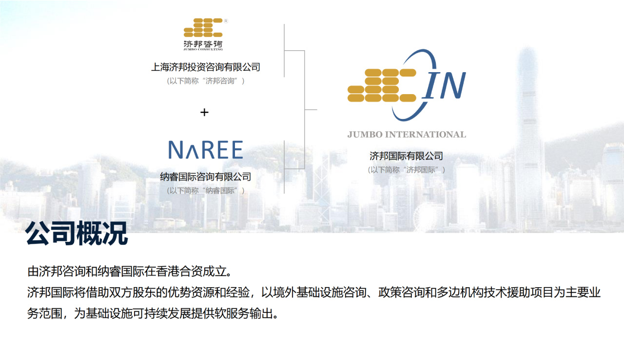 上海濟(jì)邦投資咨詢有限公司 (“濟(jì)邦咨詢”或“濟(jì)邦”) 是一家提供綜合性專業(yè)服務(wù)的基建咨詢機(jī)構(gòu)。 自2002年成立以來, 濟(jì)邦為基礎(chǔ)設(shè)施相關(guān)的各級(jí)政府、 投資運(yùn)營商、 工程承包商、 金融機(jī)構(gòu)等市場主體提供從規(guī)劃研策、投融資交易、建設(shè)交付管理、監(jiān)管優(yōu)化,直至運(yùn)營維護(hù)及資產(chǎn)管理的全壽命期或分段分項(xiàng)咨詢服務(wù)。遍及單體項(xiàng)目、片區(qū)園區(qū)及城市開發(fā)建設(shè)和管理。