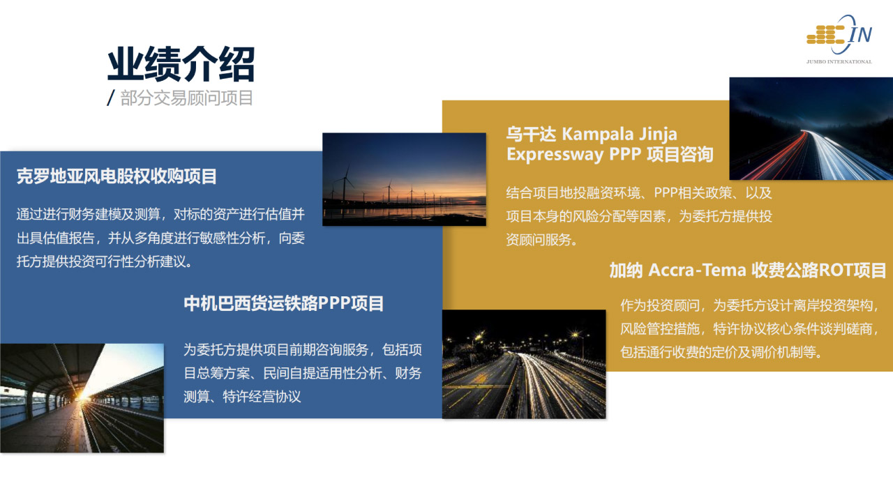 濟(jì)邦咨詢總部位于上海,分支機(jī)構(gòu)已擴(kuò)展至北京、廣州、深圳、成都、杭州、武漢、南京、天津、長沙、西安、昆明、烏魯木齊、重慶、香港等城市。截至2024年12月31日,公司累計(jì)為國內(nèi)外 500 個(gè)市/縣/區(qū)的1300余個(gè)基建項(xiàng)目提供投融資、工程咨詢、法務(wù)、監(jiān)管和管理咨詢、綠色低碳咨詢服務(wù),項(xiàng)目累計(jì)交易/投資金額超過2.6萬億人民幣。